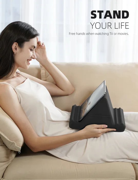 המעמד מצויד בכרית רכה ונעימה למגע, המעניקה תמיכה מושלמת ומבטיחה שימוש ארגונומי לאורך זמן. ניתן לכוונן אותו למספר זוויות שונות, כך שתוכל להתאים אותו בדיוק לתנוחה הרצויה לך, בין אם אתה על הספה, במיטה או ליד שולחן העבודה.