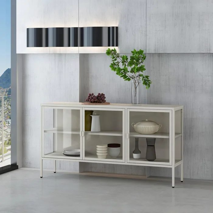 מזנון ויטרינה דקורטיבי עשוי ממתכת בעיצוב מודרני, עם שילוב אלגנטי של זכוכית