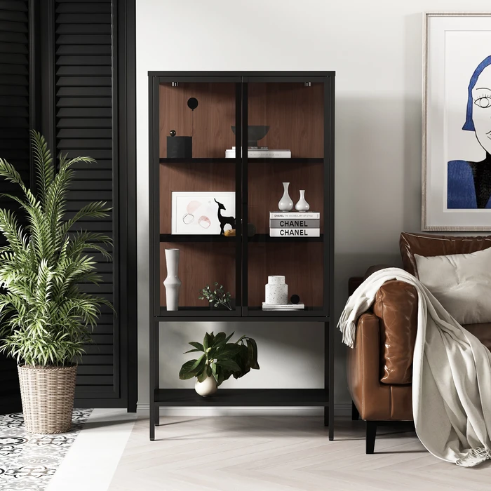 ויטרינת מתכת מודרנית עם דלתות זכוכית וגב בגוון עץ חמים
