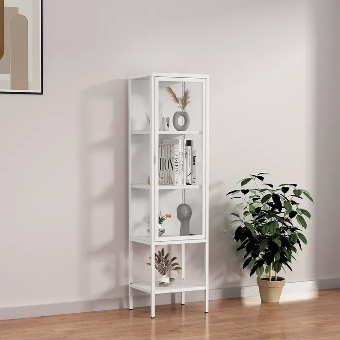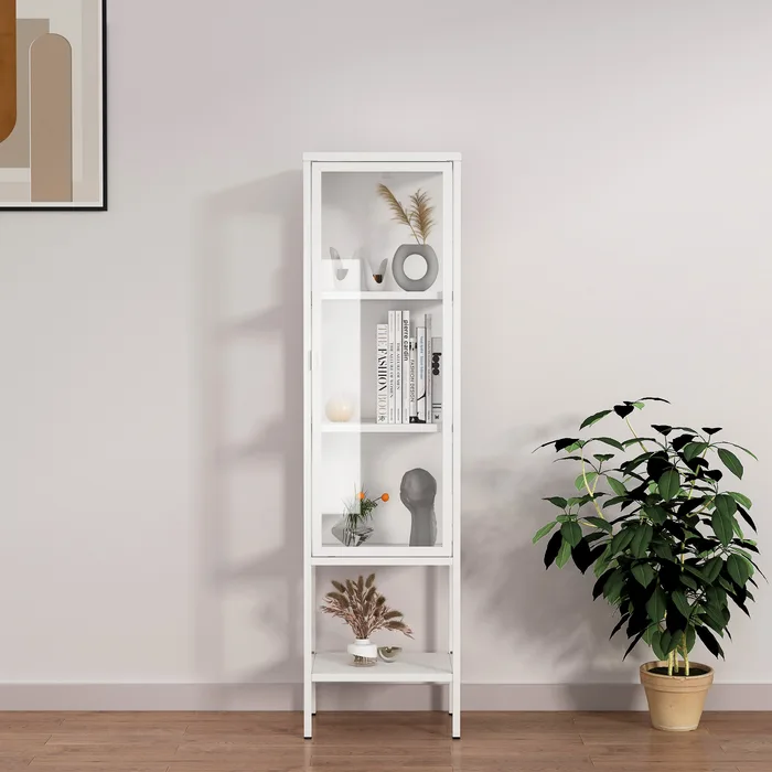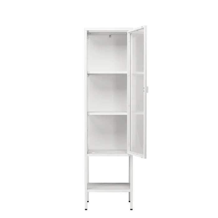 ויטרינה מתכת עם דלתות זכוכית בפשטות מדויקת, ונוכחות עוצמתית.